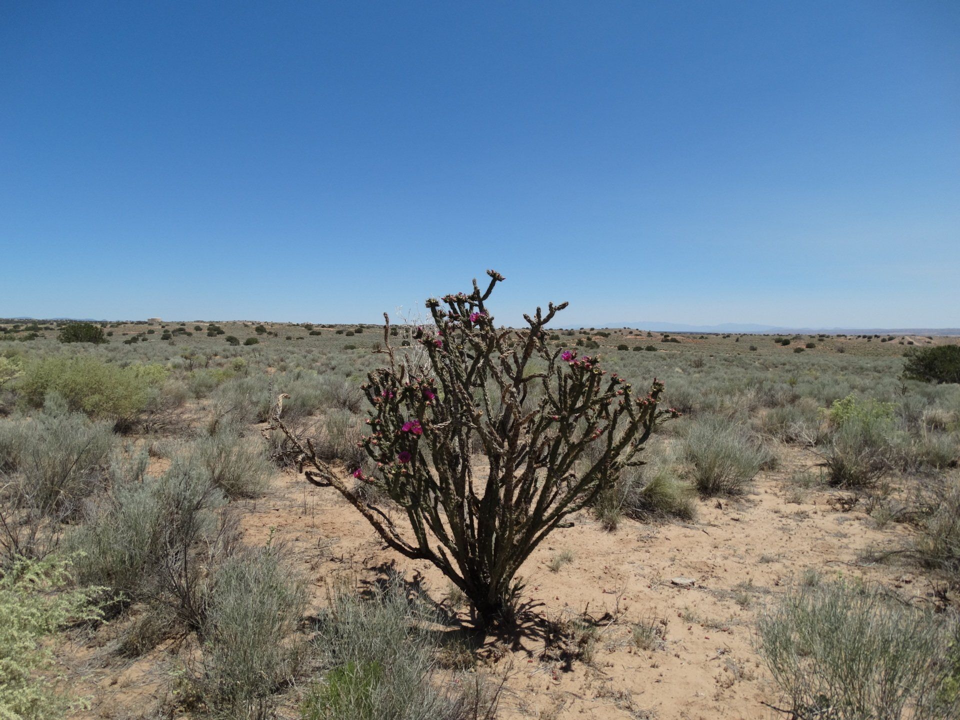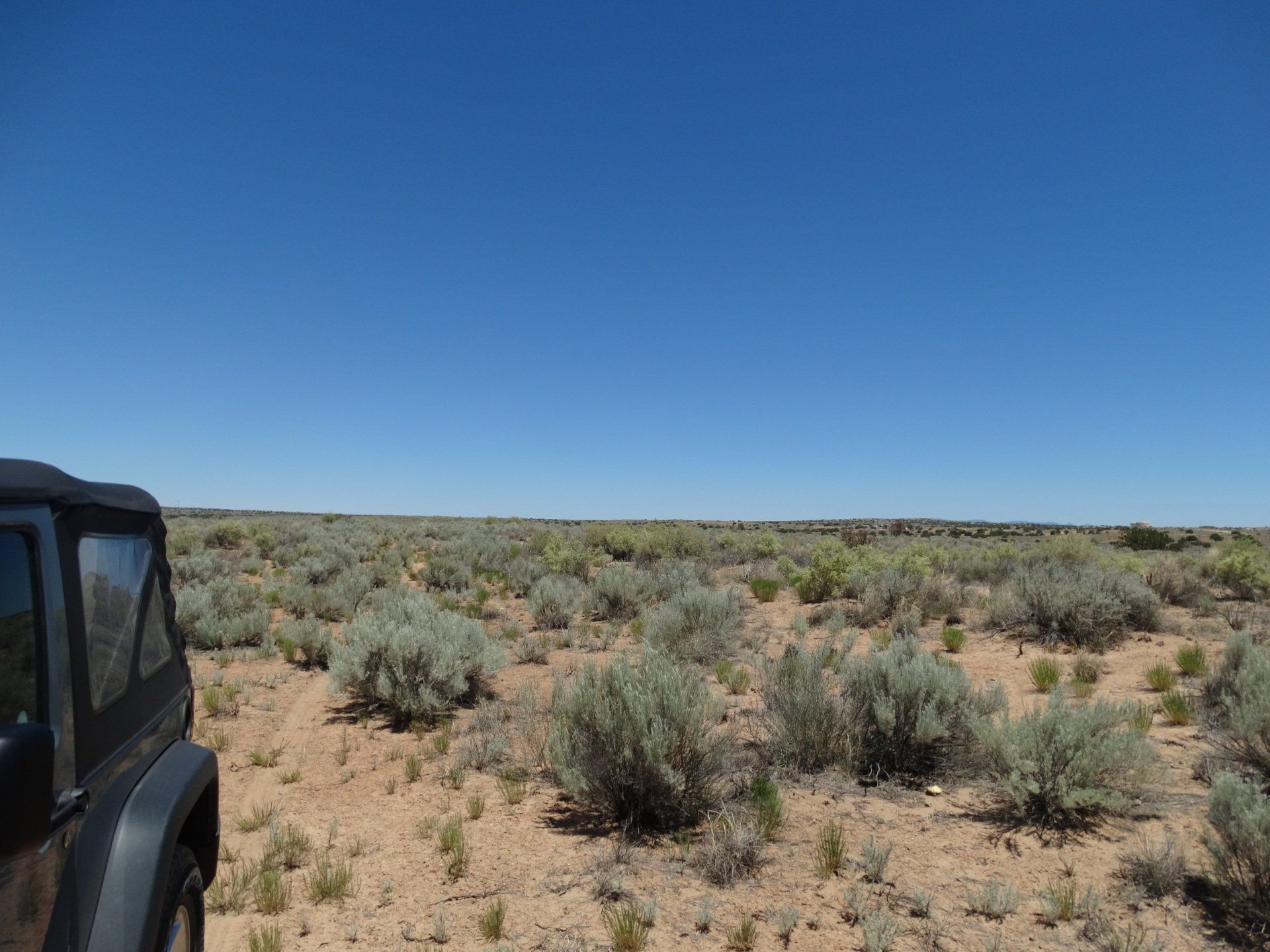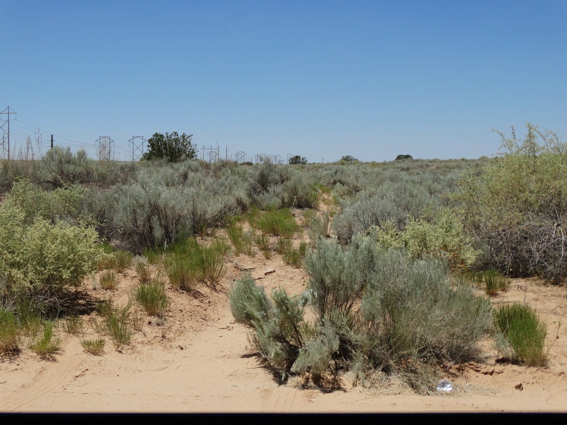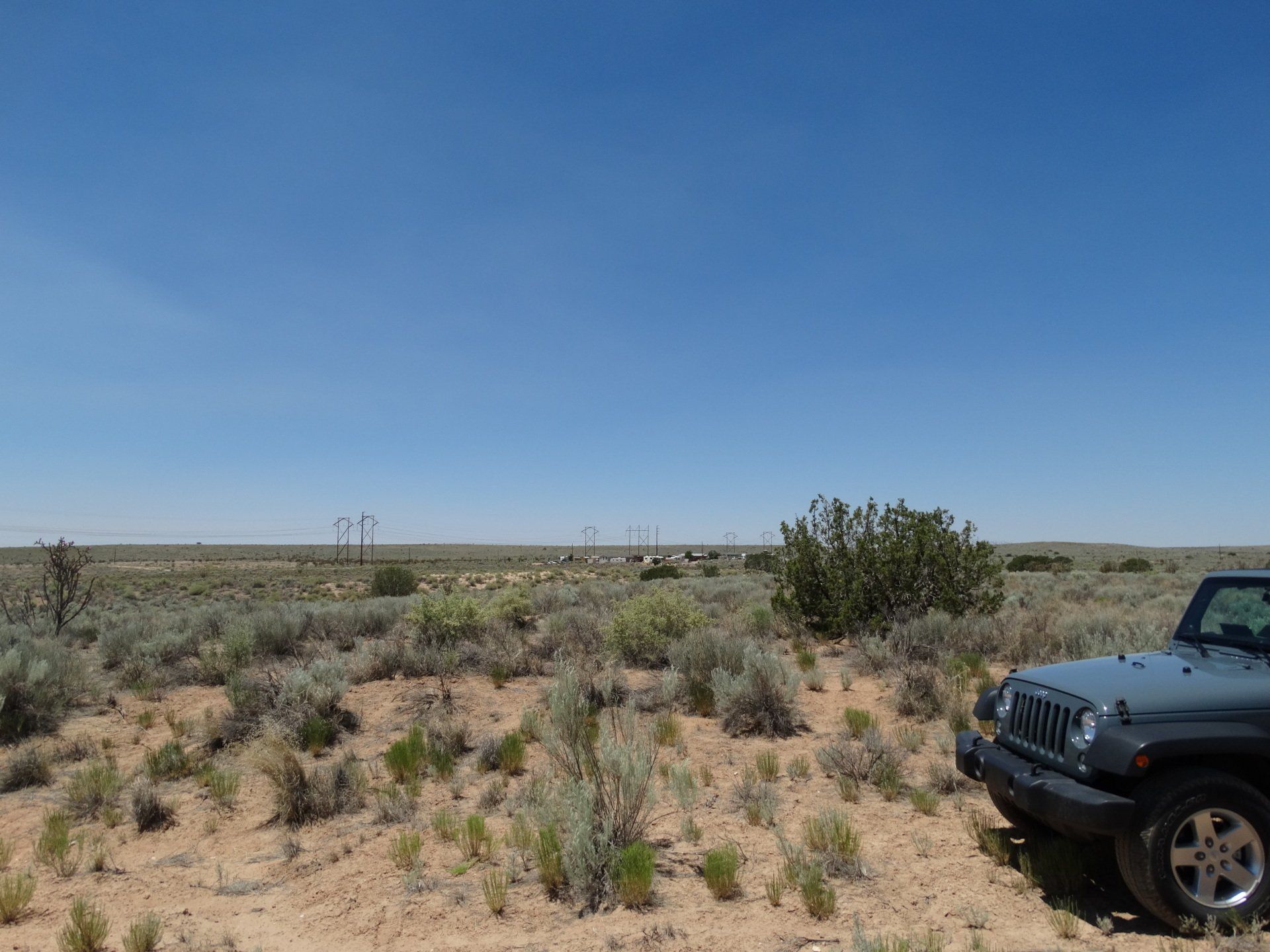 The only sound I heard was the loud buzz of crickets! I also saw a cool stick bug on the jeep. Lots of native plants, sagebrush, and a few scattered cactus. Beautiful views of the Sandia Mountains to the E and SE.