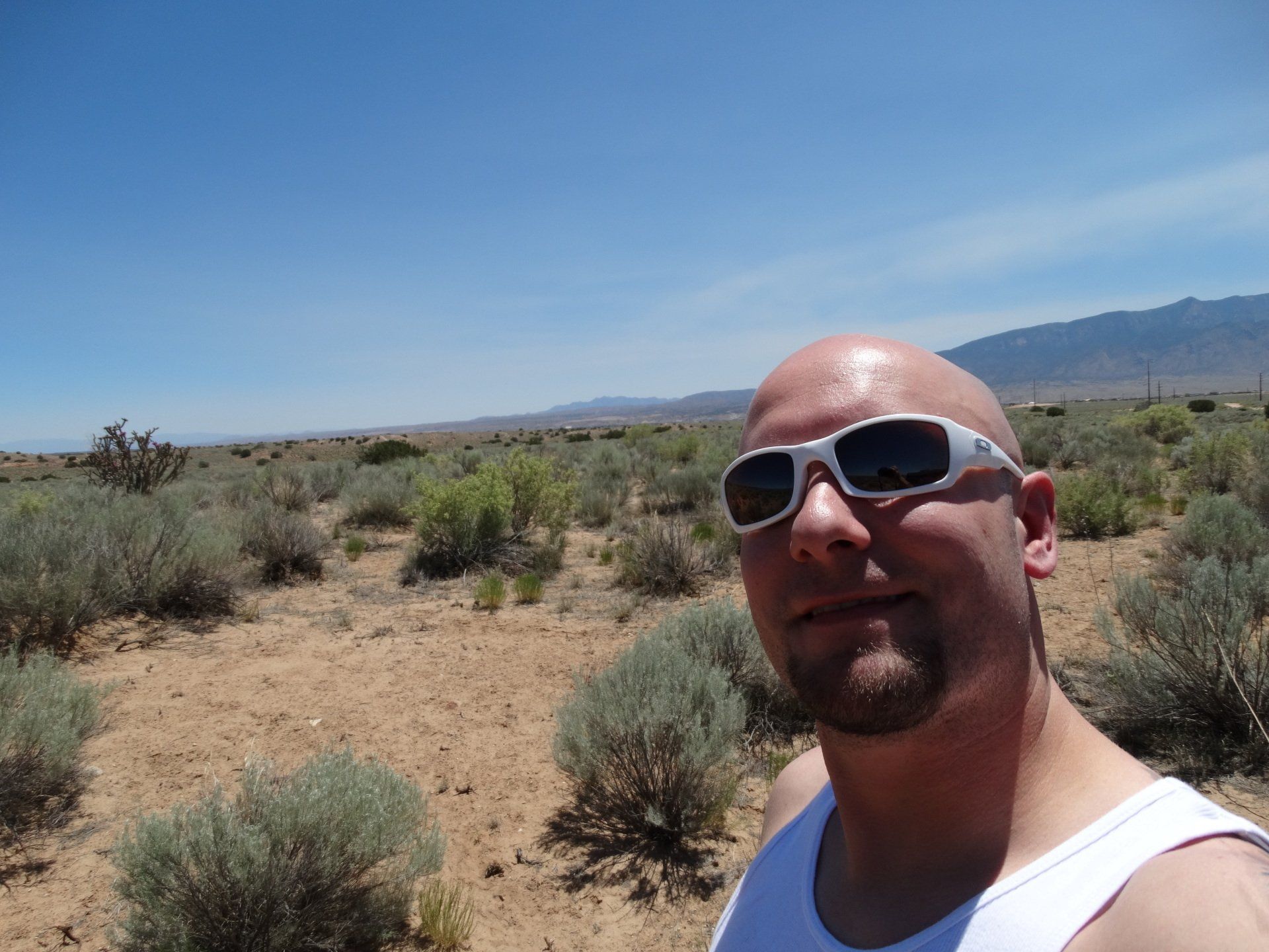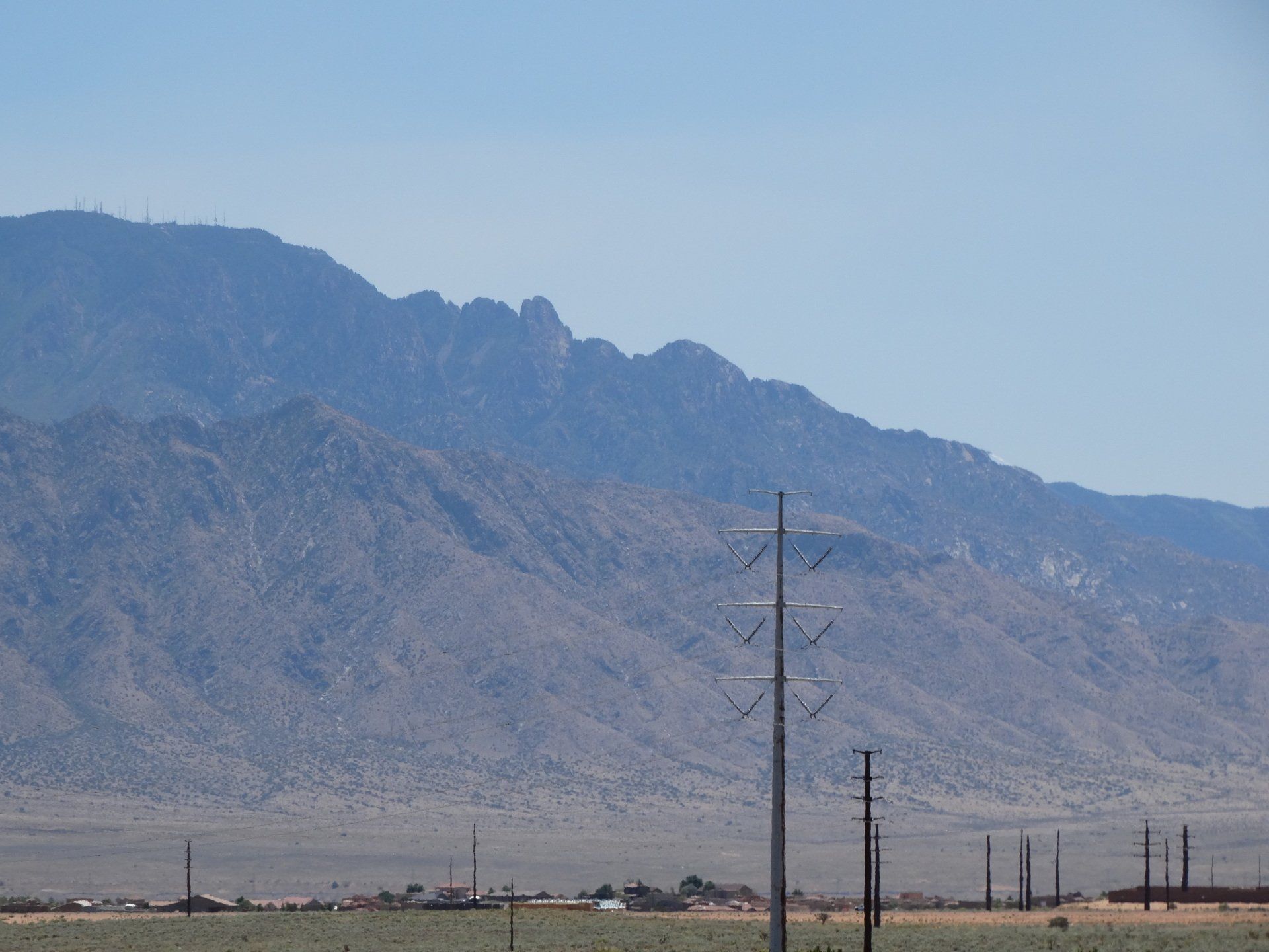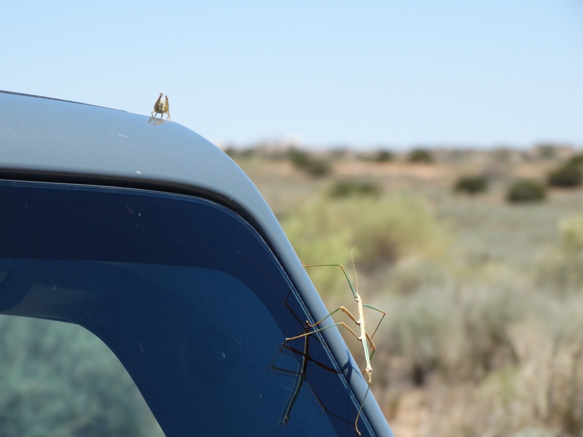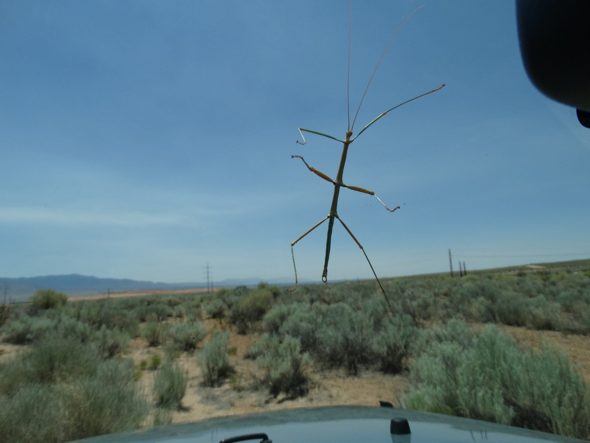 The only sound I heard was the loud buzz of crickets! I also saw a cool stick bug on the jeep. Lots of native plants, sagebrush, and a few scattered cactus. Beautiful views of the Sandia Mountains to the E and SE.